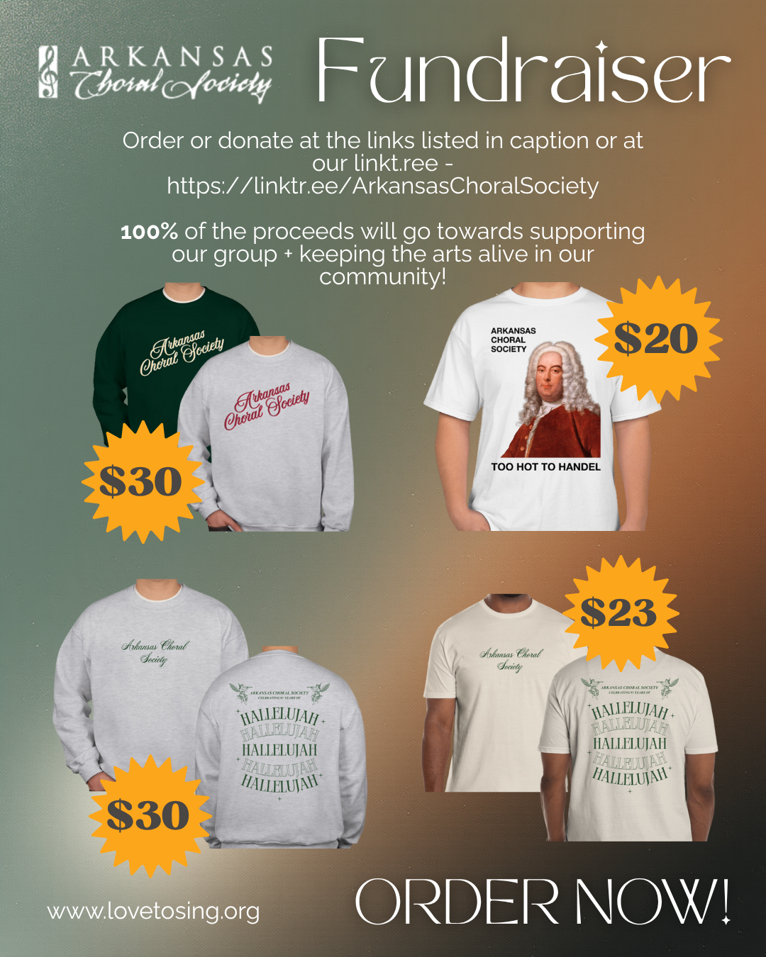 The performance features amazing soloists, as well as accompaniment from members of the Arkansas Symphony Orchestra. In order to continue this tradition and legacy, we need your support! Please consider buying a sweatshirt or t-shirt. All proceeds will go towards making our concert happen!