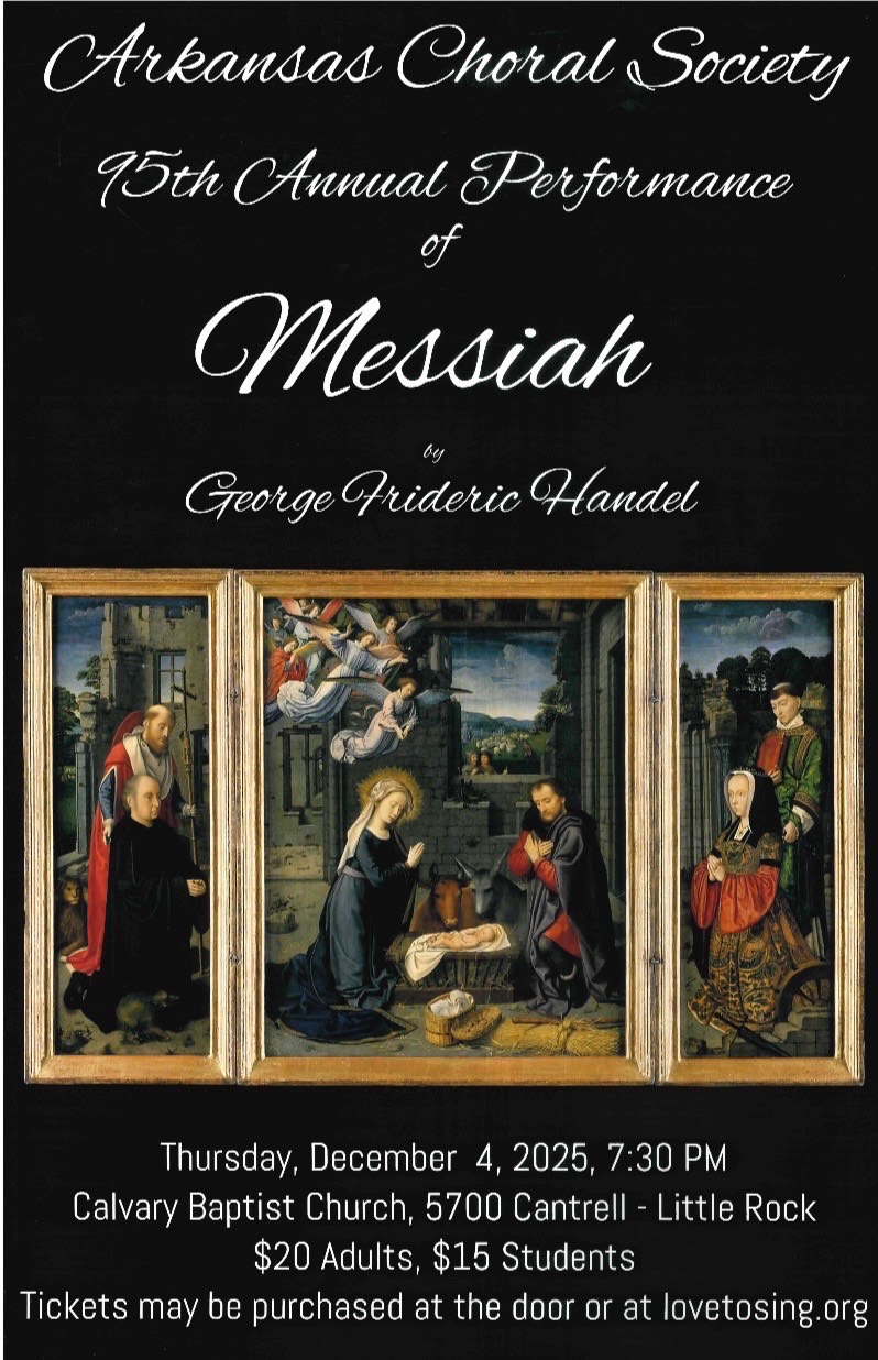 Every Autumn, volunteer members of the community from all across Central Arkansas gather to rehearse and perform Handel’s beloved choral masterpiece – The Messiah, to help the community ring in the Holiday Season. This year’s performance will be the Society’s 95th consecutive year!