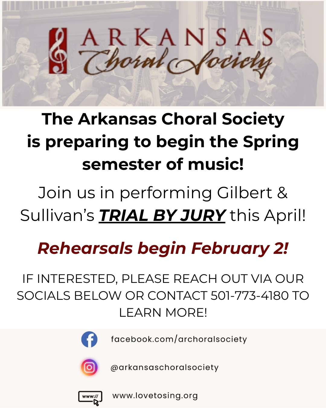 Have some questions? Please feel free to reach out to us at anytime! We are available by email at hello@lovetosing.org or fill out the contact form, and we will get back to you as soon as possible. Also, make sure to follow us on social media to get the latest updates about the Arkansas Choral Society.